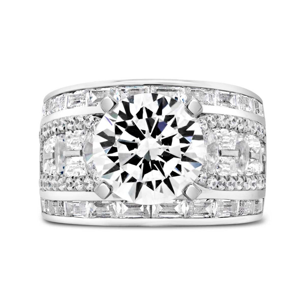 The classic round-cut diamond is a timeless favorite. Its brilliant facets complement the boldness of a wide band, creating a balanced and harmonious design. -